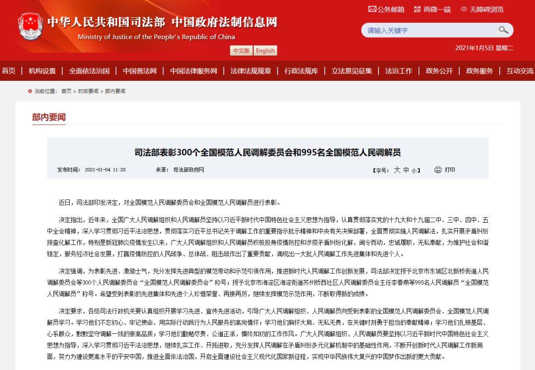 近日,司法部印发决定,对300个全国模范人民调解委员会和995名全国模范人民调解员进行表彰。其中,我市1个人民调解委员会获评"全国模范人民调解委员会"、4名人民调解员获评"全国模范人民调解员"。