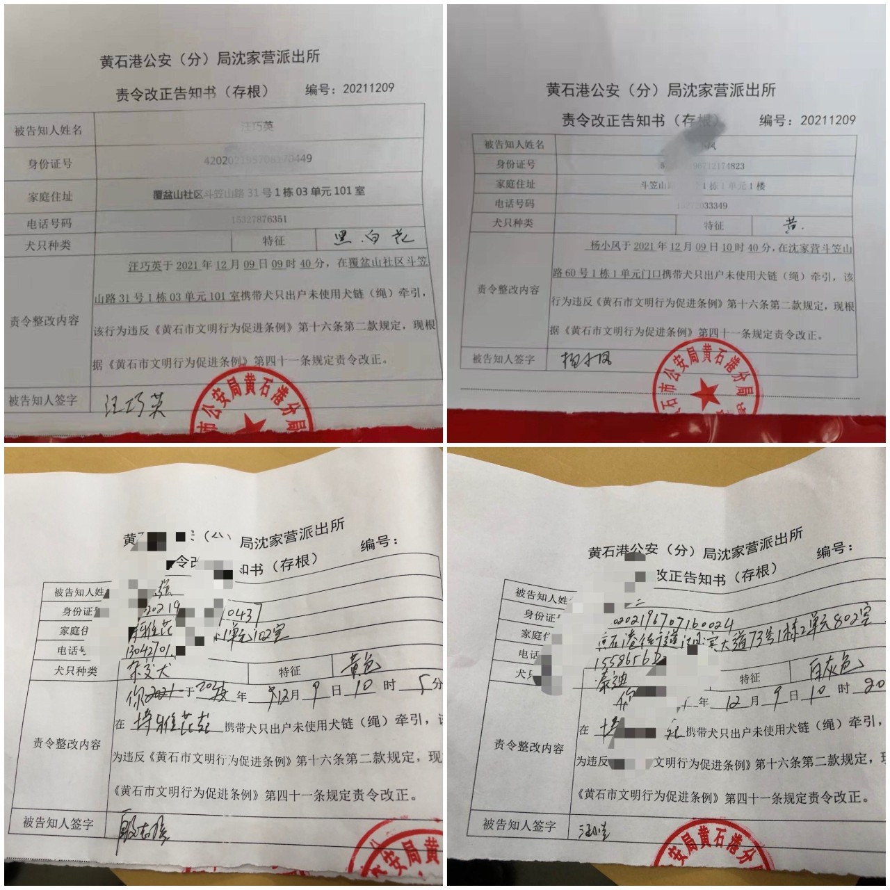 并根据《黄石市文明行为促进条例》的有关规定,对遛狗不牵绳的不文明行为,下发责令改正告知书。
