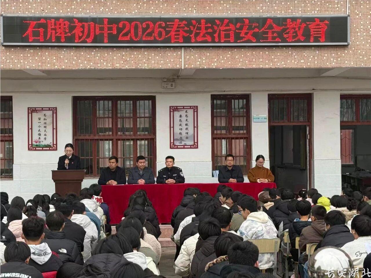 为深入推进未成年人法治宣传教育,增强青少年学生的法律意识和自我保护能力,营造平安和谐的校园环境,3月4日春季开学之际,荆门市钟祥人民法院石牌人民法庭联合钟祥市公安局石牌派出所,共同走进石牌镇初级中学,开展“与法同行护航青春”主题法治宣讲活动,为全校师生送上一堂生动深刻的“开学法治第一课”。