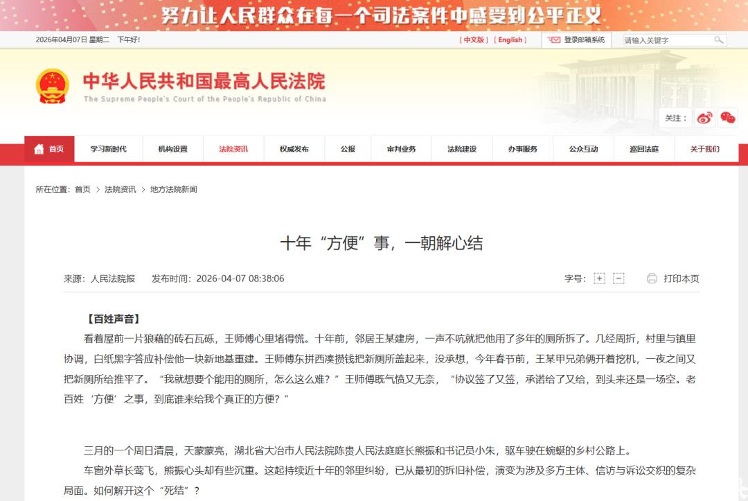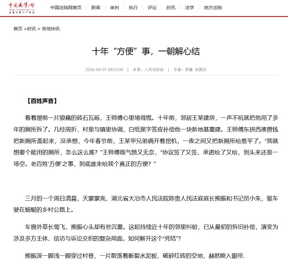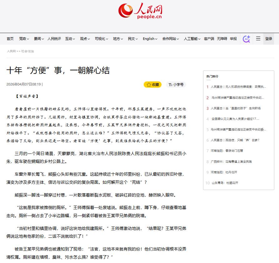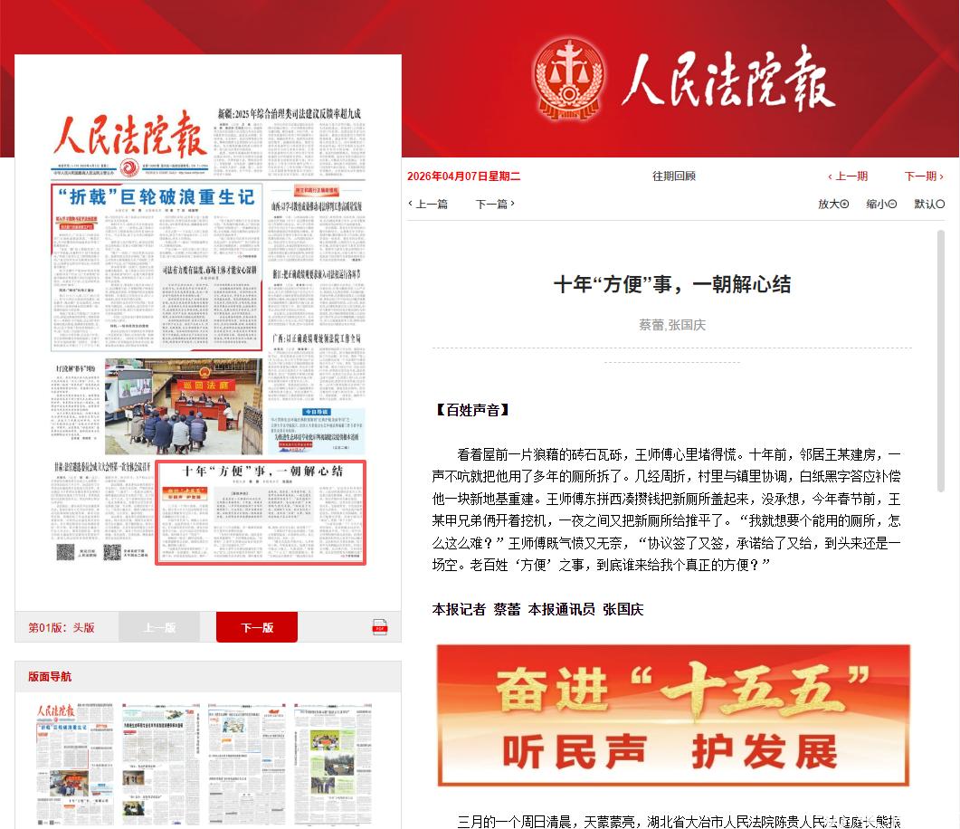 4月7日,《人民法院报》头版报道了大冶法院陈贵法庭成功化解一起持续近十年的邻里纠纷。报道刊发后,迅速被人民网、最高人民法院官网、《人民法院报》公众号、中国法院网等权威平台转载,引发广泛关注。