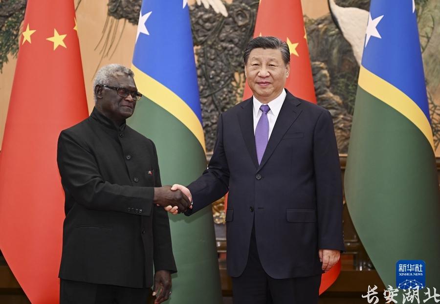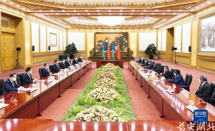 习近平指出,中国和所罗门群岛是彼此值得信赖的好朋友、可以依靠的好兄弟。建交以来,两国友好合作后来居上,走在了中国同太平洋岛国关系前列,成为不同大小国家和发展中国家团结合作、携手发展的典范。事实证明,中所建交顺应时代潮流,契合国际大势,符合两国人民根本利益,是正确选择。中方愿同所方加强战略沟通,深化各领域合作,推动两国全面战略伙伴关系行稳致远、好上加好,更好造福两国人民。