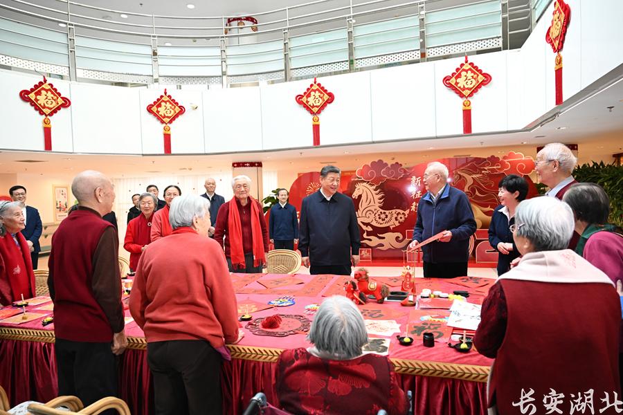 在银龄老年公寓,习近平详细了解老年人健康检查、康复训练、日常起居照料等情况。大厅里,一些老人正在写春联和福字,习近平来到他们中间,欣赏他们的创作,勉励他们老骥伏枥、老有所为,祝他们健康长寿、春节快乐。