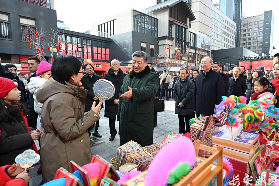 正值农历小年,隆福大厦前,新春市集吸引了大量市民和游客。习近平饶有兴致察看各式年货摊位,同现场群众亲切交流。他愉快地向大家讲起年少时多次到隆福寺的情景,还购买了几份特色食品和文创产品。