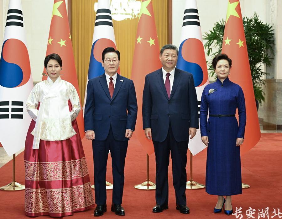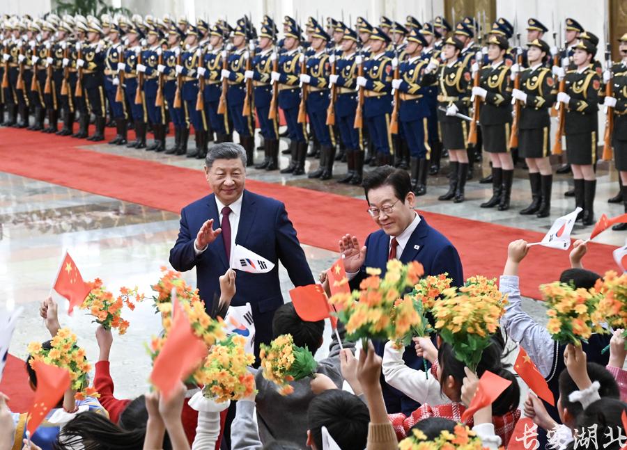 会谈前,习近平和夫人彭丽媛在人民大会堂北大厅为李在明和夫人金惠景举行欢迎仪式。