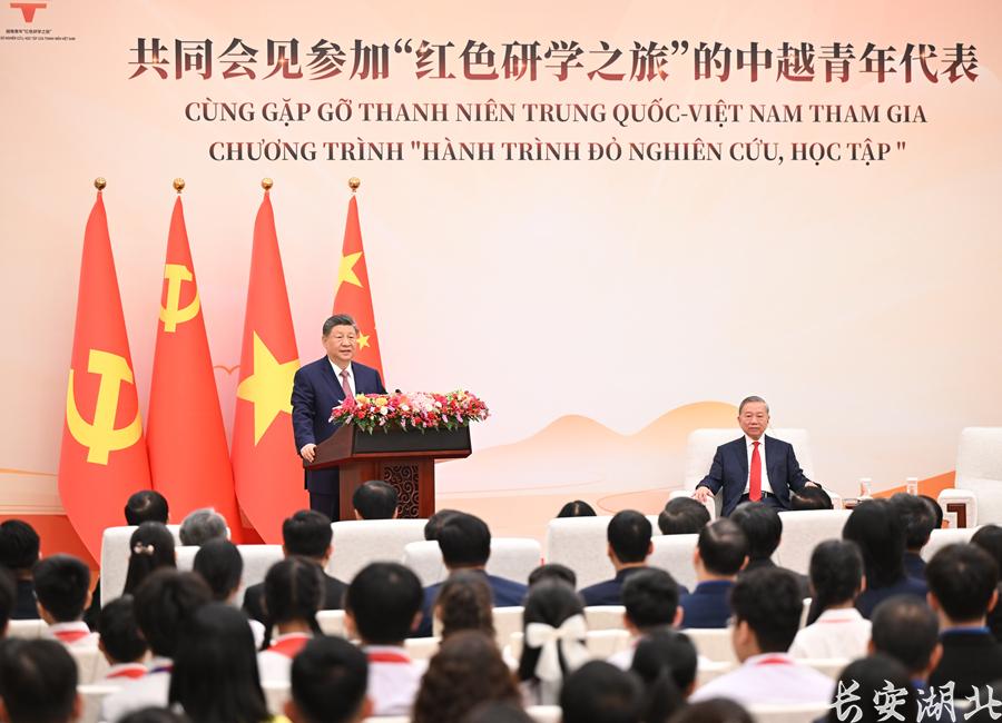 4月15日上午,中共中央总书记、国家主席习近平在北京人民大会堂同来华进行国事访问的越共中央总书记、国家主席苏林共同会见参加“红色研学之旅”的中越青年代表。