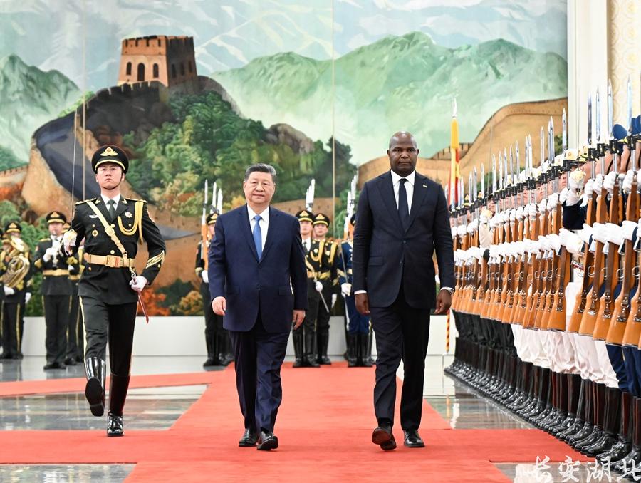 会谈前,习近平和夫人彭丽媛在人民大会堂北大厅为查波和夫人盖塔举行欢迎仪式。