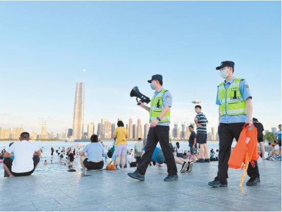 武汉警方在江边巡逻开展防溺水宣传。