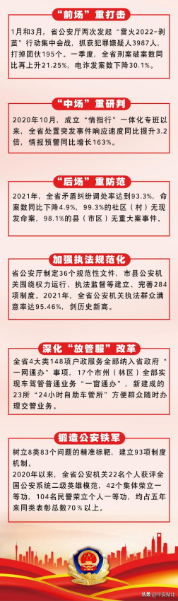 近两年来,全省维护稳定取得新进步,平安建设开创新局面,服务大局彰显新担当,改革创新取得新突破,队伍面貌展现新气象。省内刑事发案持续下降,公安机关破案持续上升,群众安全感、群众对公安机关扫黑除恶满意率和公正执法满意率显著提高,2021年分别达到98.64%、95.76%、95.46%。湖北省被评为“平安建设优秀省份”,6个市县被授予“长安杯”。