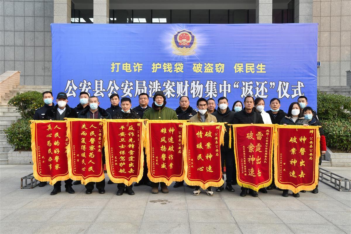 在返还仪式上,该局党委副书记、副局长何世龙向参会人员通报了2022年以来打击违法犯罪取得的成效和战果,介绍了此次集中返还的赃款赃物情况,并向受损群众代表现场返还追缴财物。受损群众代表对公安县公安局不畏艰辛、竭尽全力追赃挽损表示高度赞扬,并向案件主侦民警赠送了锦旗表示诚挚感谢。