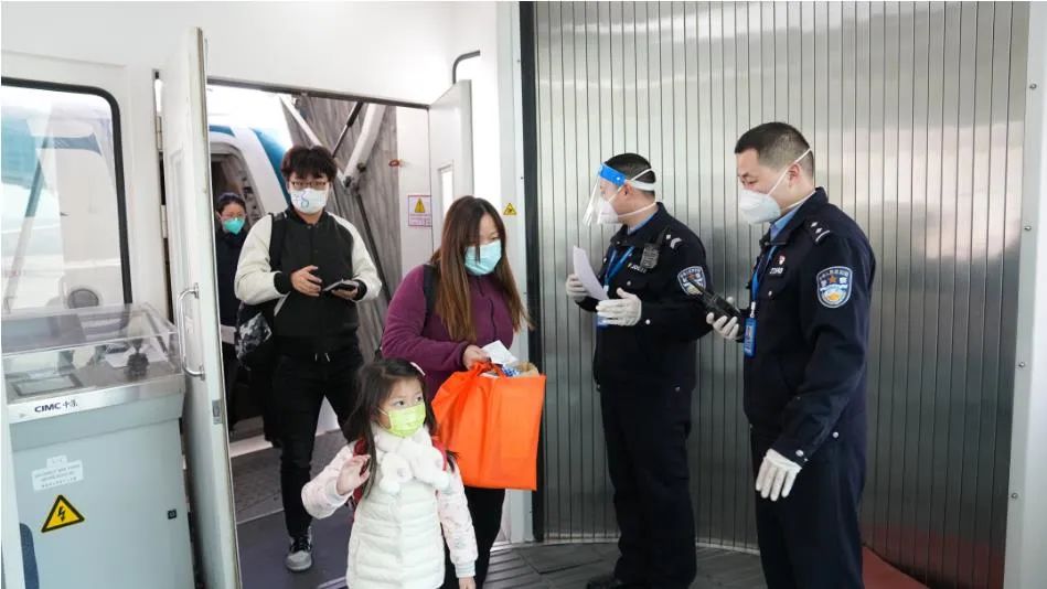 ▲湖北移民管理警察在客机梯口迎接归国旅客