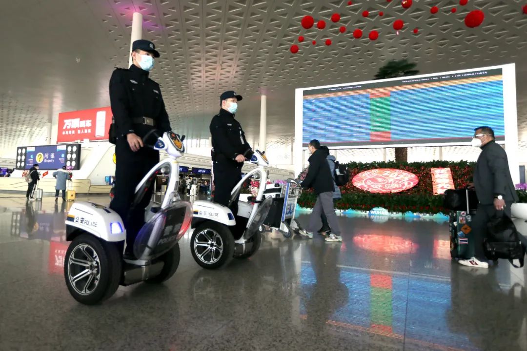 ▲1月17日,武汉天河国际机场T3航站楼,湖北省公安厅机场公安局航站区派出所民警采取“步巡+车巡”强化显性用警