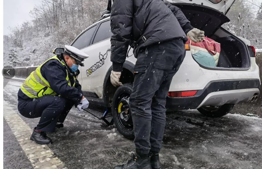 ▲湖北省公安厅高速公路警察总队利川大队民警巡逻途中帮助遇险群众