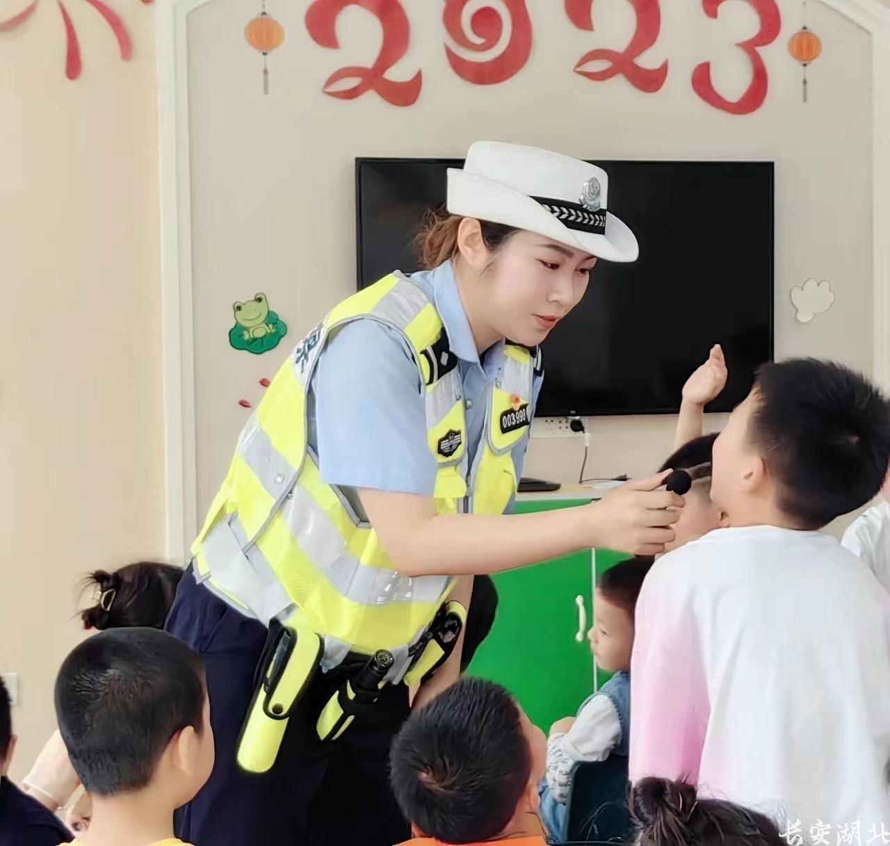 民警结合学校周边道路交通环境,通过“熟悉交通信号灯”“认识斑马线”“怎样安全过马路”等交通安全常识,用通俗易懂的语言由浅入深地与小朋友们交流、互动,教育新生们从小重视交通安全,养成文明交通良好习惯,以“小手拉大手”的形式将道路交通安全知识送进千家万户。
