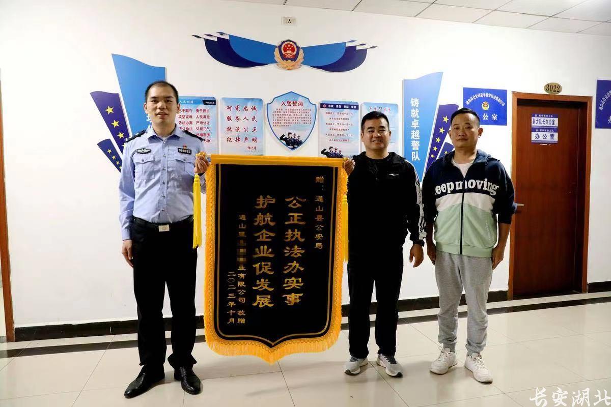 “感谢公安机关打击犯罪,为企业挽回损失!”10月24日,咸宁市通山县经济开发区一回乡投资重点企业将一面写有“公正执法办实事、护航企业促发展”的锦旗送到县公安局民警手上,表达对公安机关打击犯罪、追赃挽损的感谢。