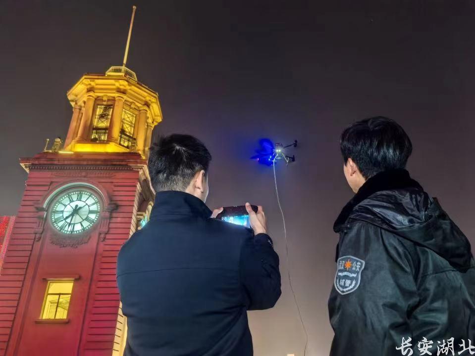 “10,9,8……3,2,1”当江汉关跨年钟声敲响,现场十余万市民一起倒数庆祝2025新年快乐时,视侦支队无人机大队副大队长刘宇飞和辅警张玉泉使用“空中鹰眼”警用无人机开展空中巡逻,利用搭载红外热成像和变焦双光镜头守护市民平安。值得一提的是,本次使用的系留无人机可实现长航时悬停,解决了传统无人机需要更换电池的痛点。