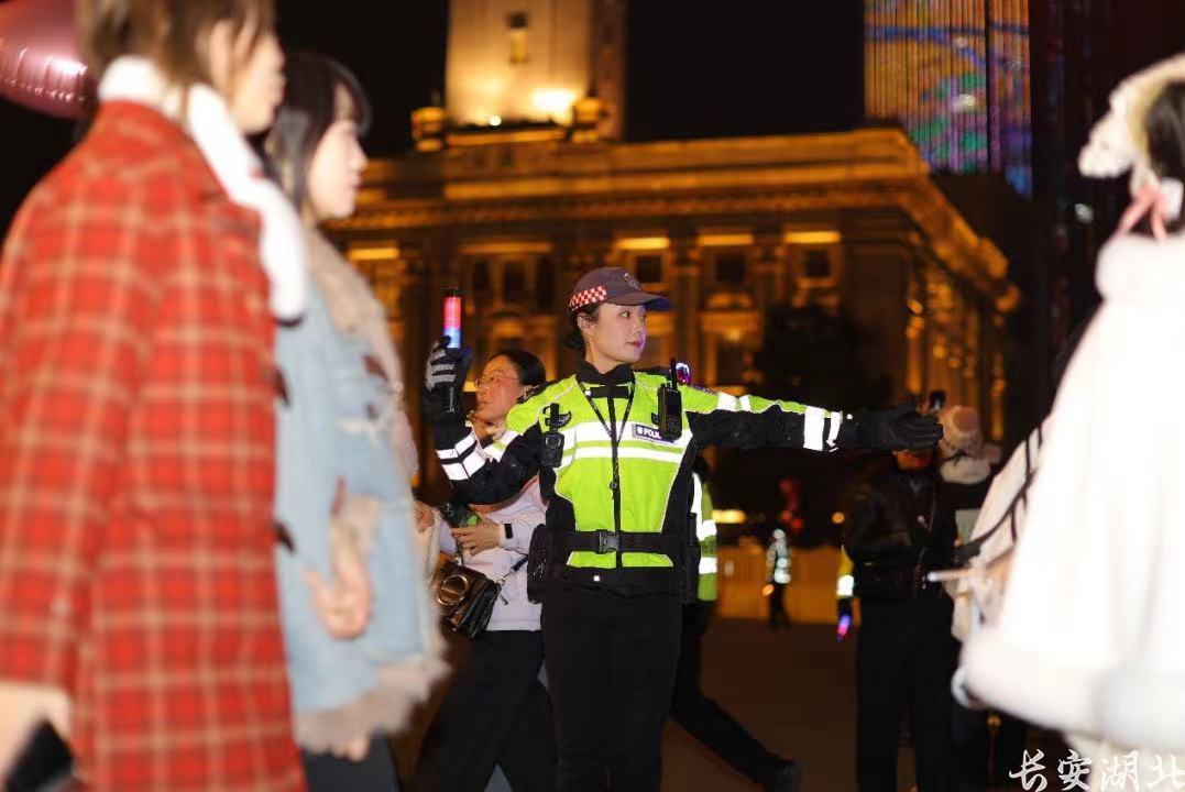 除了江汉关以外,夜幕下的两岸灯光秀正在精彩上演,吸引了无数市民游客驻足观看。长江大桥下,户部巷、斗级营等网红打卡处也是人流如梭,市民群众在此聚集,等待新年的钟声敲响。“请问中华路码头怎么走?”正在户部巷执勤的中华路所副所长全抱龙耐心为游客介绍,当晚已经为数十位游客充当“警色导游”解疑答惑,指引方向。
