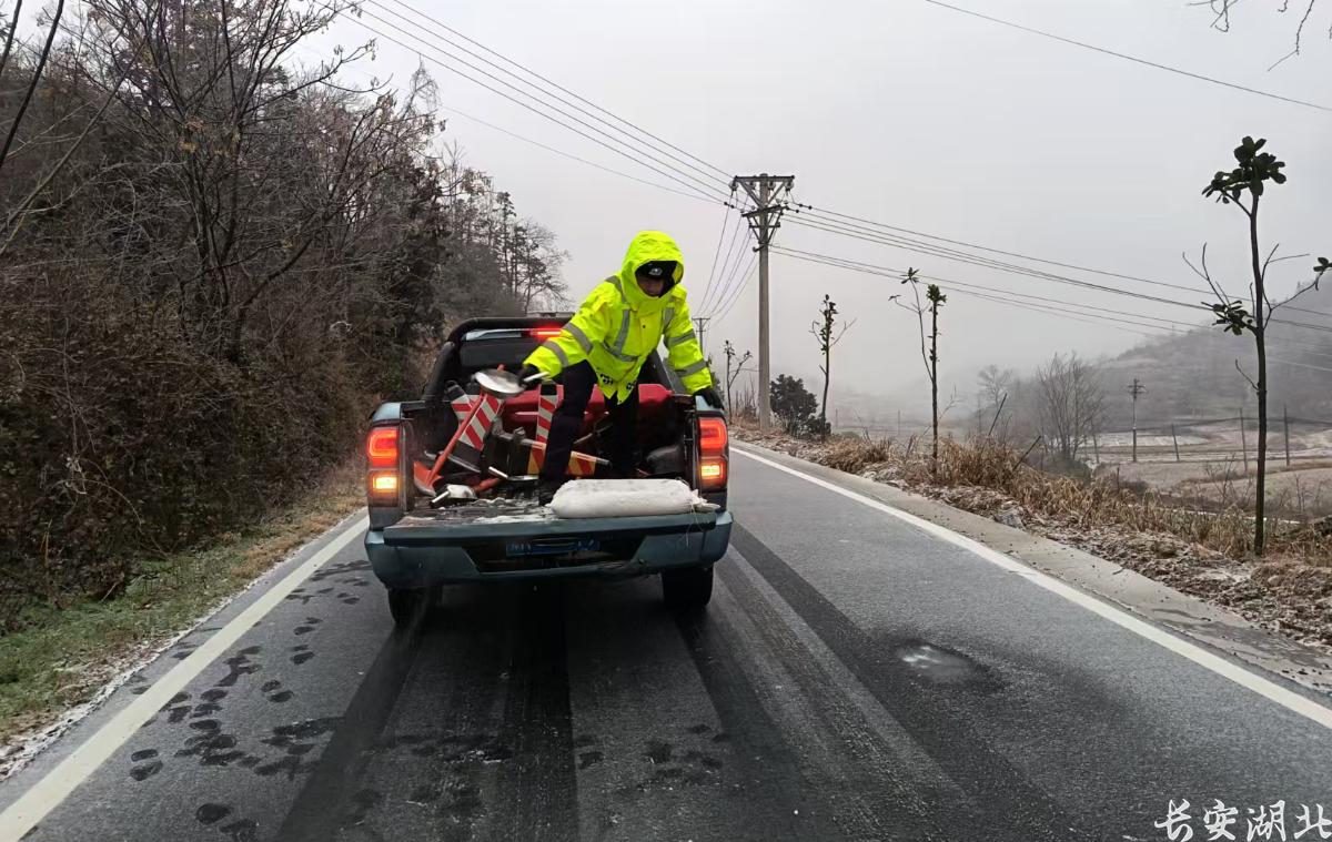 ▲宜昌交警在仁和坪镇叶产坪村井家河路段铺撒融雪剂