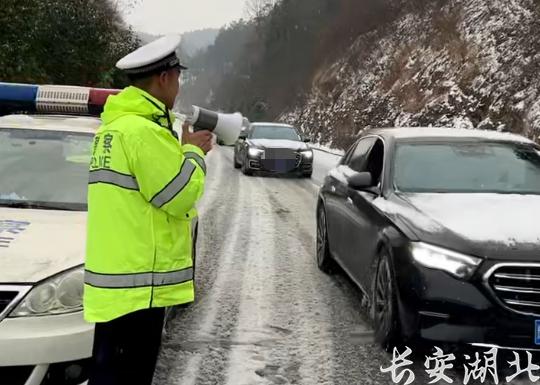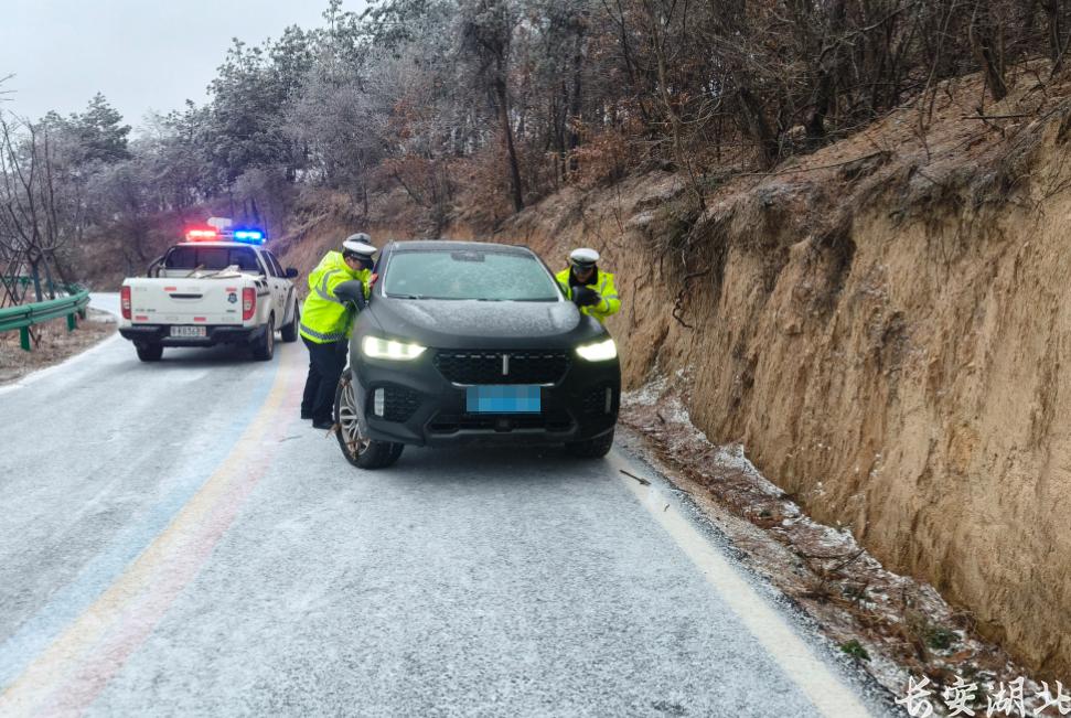 ▲十堰交警在枫土路提醒过往车辆冰雪天气路面湿滑、减速慢行