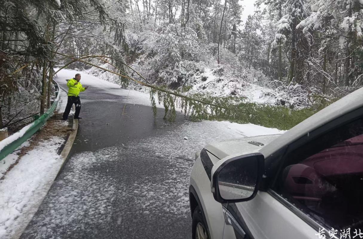 ▲黄冈交警深入三角山景区,清理路面倒伏树干保障安全畅通