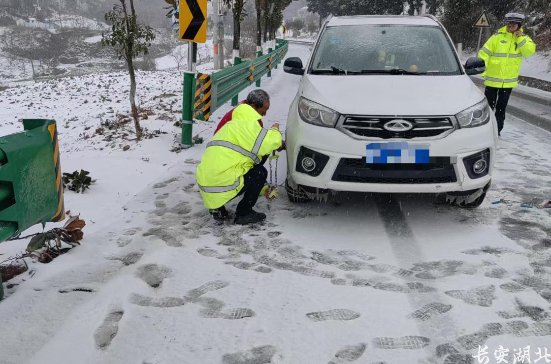 ▲十堰交警在209国道积雪路段帮过往车辆安装防滑链