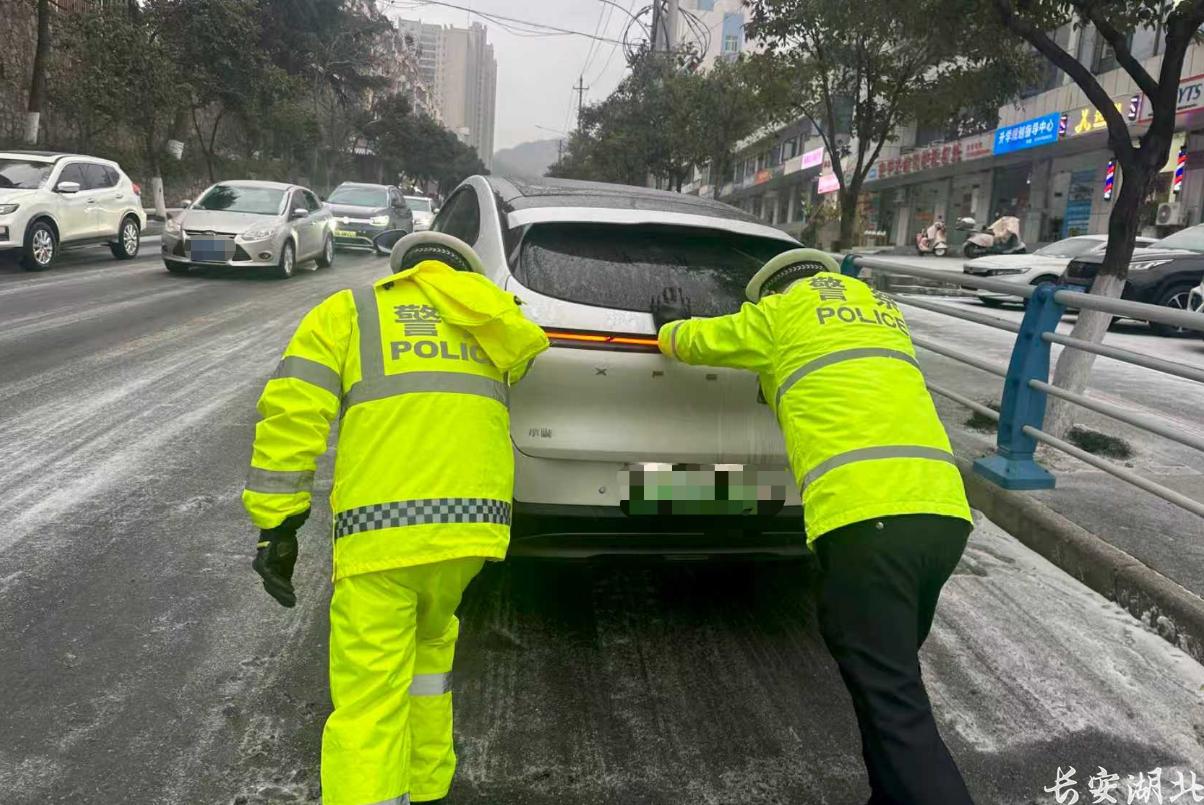 ▲荆门交警在象山二路路段帮助受困车辆脱困