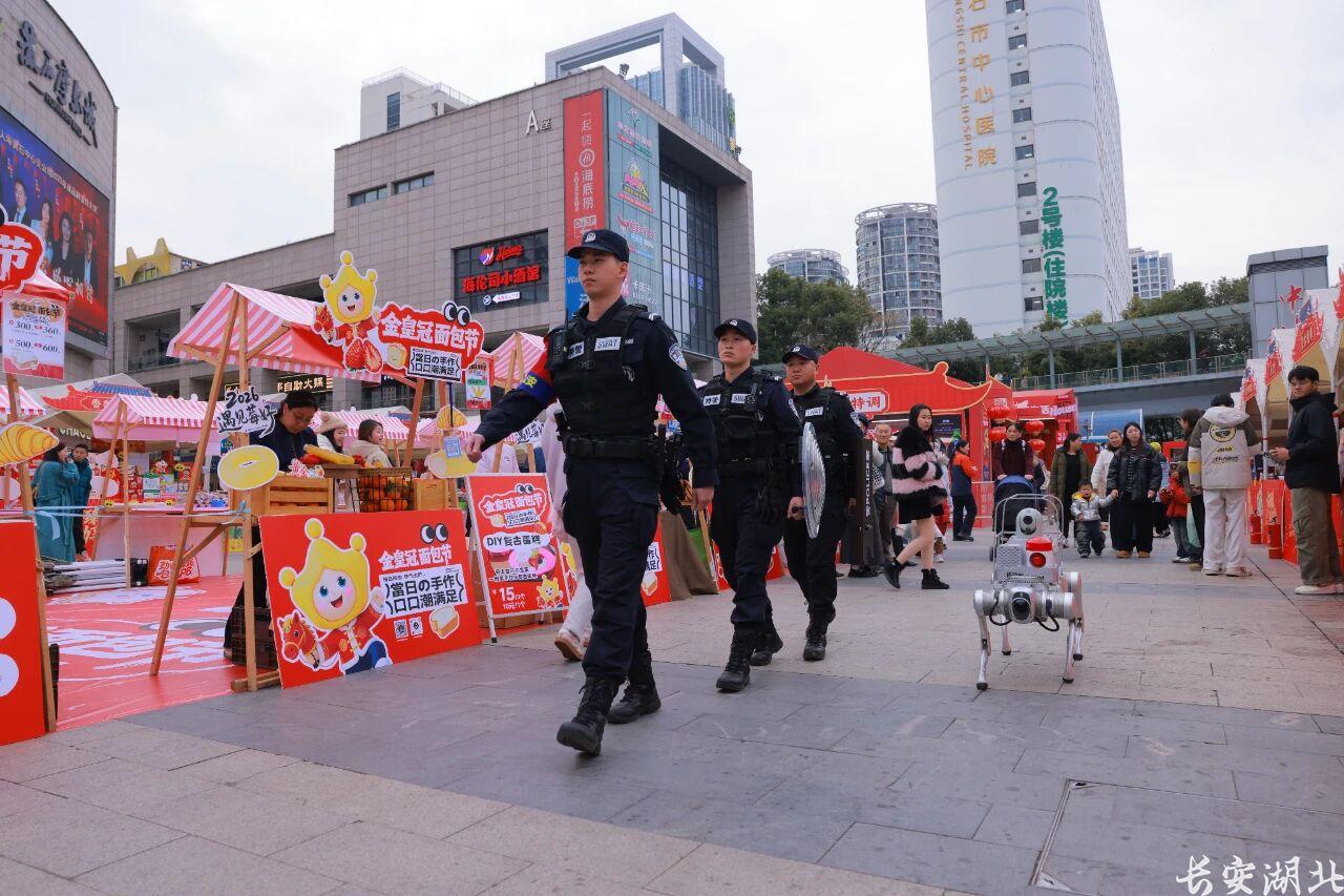 2025年12月31日晚,在湖北省黄石市交通路步行街钟楼广场上,跨年嘉年华活动举行。黄石市公安局反恐怖和特警支队巡逻大队队员带着警用机器狗在人群中彻夜巡逻,保障了活动安全顺利进行。
