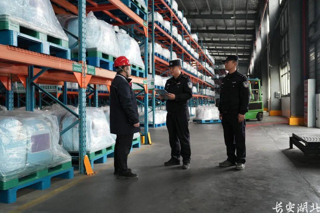 就在民警柯诚发放传单的同时,副所长陈冠宇和辅警郭栋正在辖区一仓储物流园排查安全隐患。