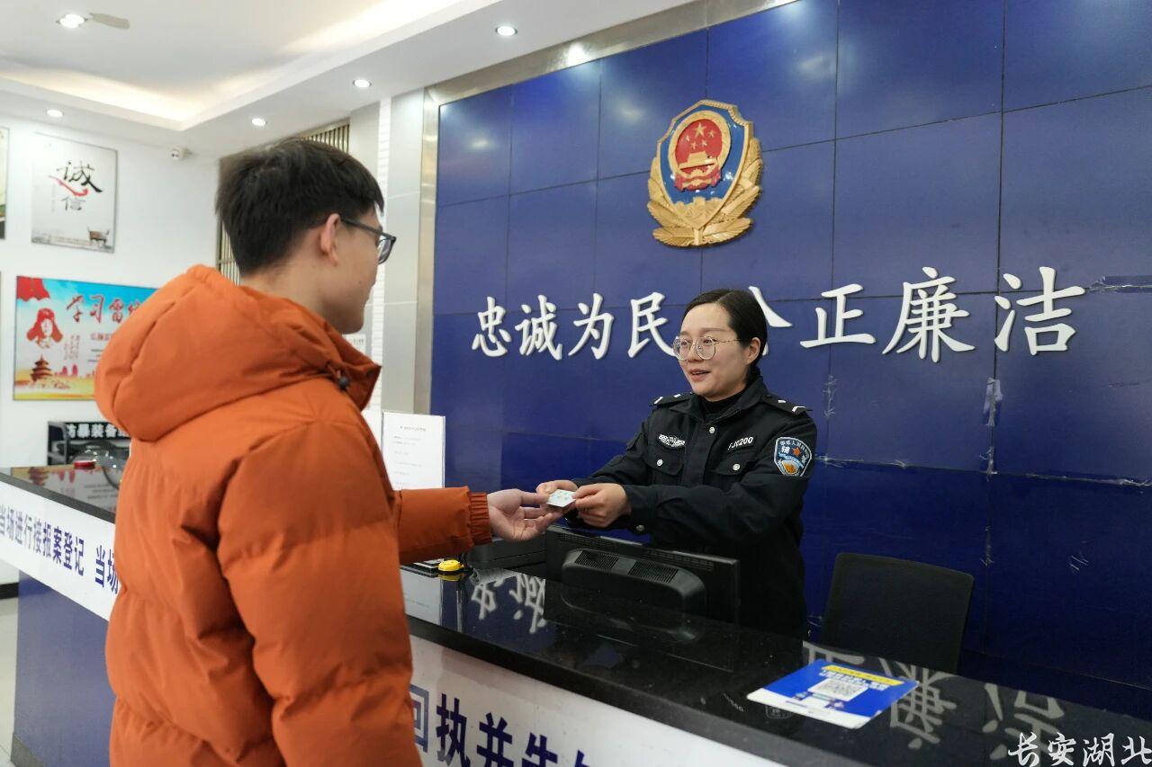 上午10点,在兴隆派出所户籍窗口,辅警孙晓菊将办好的证件递给企业新员工小张。