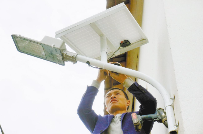 工作人员正在安装“户户亮”太阳能灯