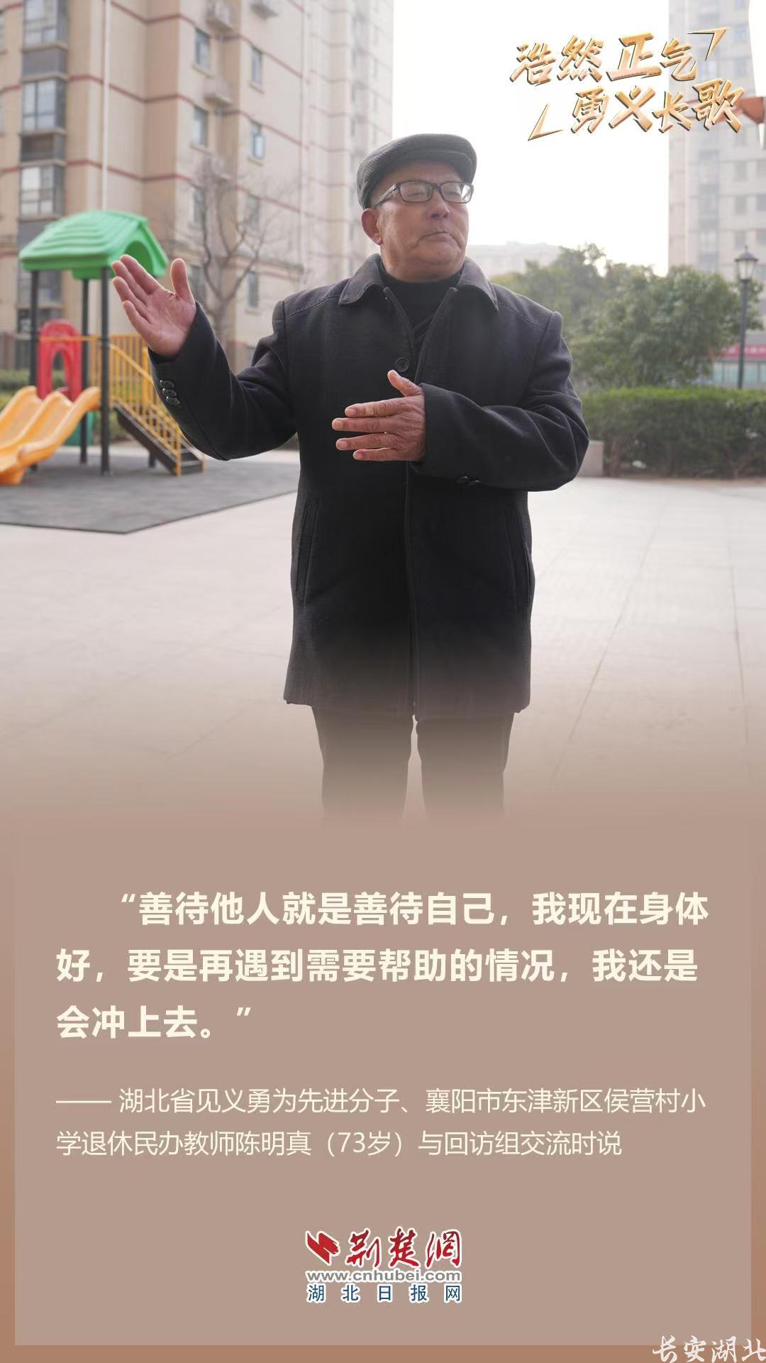在荆楚这片英雄辈出的热土上,陈明真的身影从来不是一道孤光。最新数据显示,湖北全省已有116人获国家级表彰,1256人受省级嘉奖,23人荣登中央政法委“见义勇为勇士榜”。这串闪光的数字背后,是一个个可歌可泣的感人故事,是一曲曲荡气回肠的正气之歌。这里有“苟利国家生死以”的家国担当,有“岂因祸福避趋之”的无畏勇毅,更有“众人拾柴火焰高”的温暖群像。从湍急江水中勇救落水者的身影,到烈焰前逆行而上的步伐;从夺刀制暴的瞬间爆发,到守护生命财产的日夜坚守……正是这千千万万个如陈明真般的平凡英雄,在危急关头一次次奋不顾身的挺身而出,用血肉之躯筑起了社会正气充盈、道德高地耸立的坚实根基。