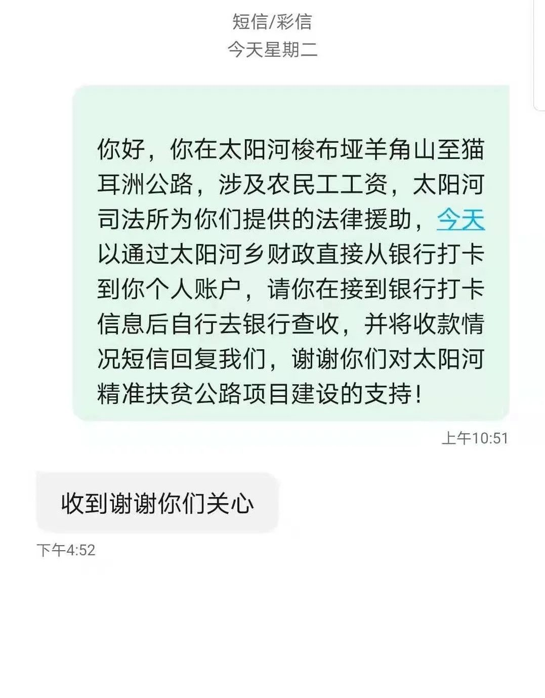2020年12月15日,恩施市太阳河公共法律服务站的工作人员给61名农民工打电话、发送短信提醒查收追回的工资。