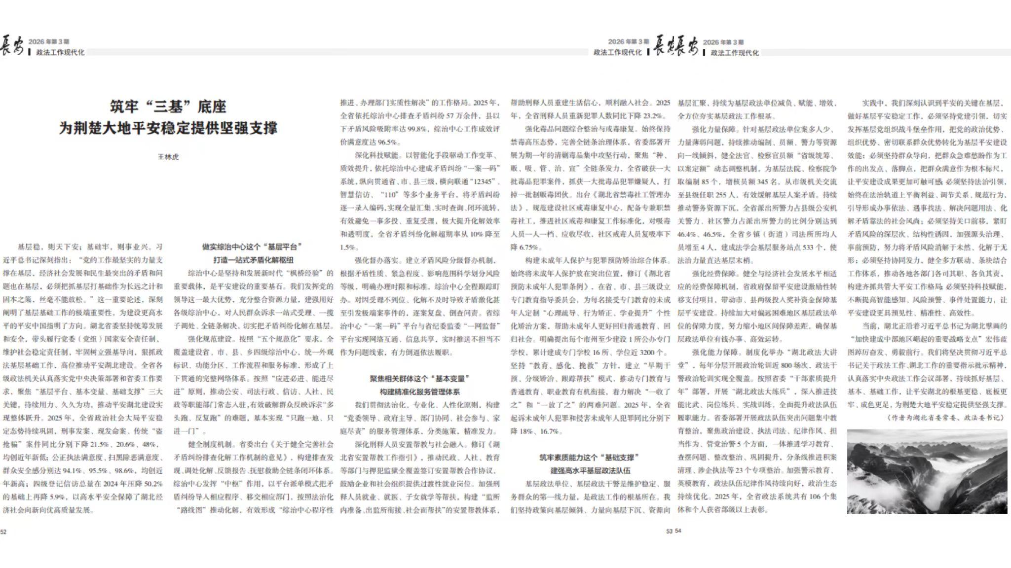 2026年第3期《长安》杂志刊发湖北省委常委、政法委书记王林虎署名文章《筑牢“三基”底座为荆楚大地平安稳定提供坚强支撑》。全文如下。