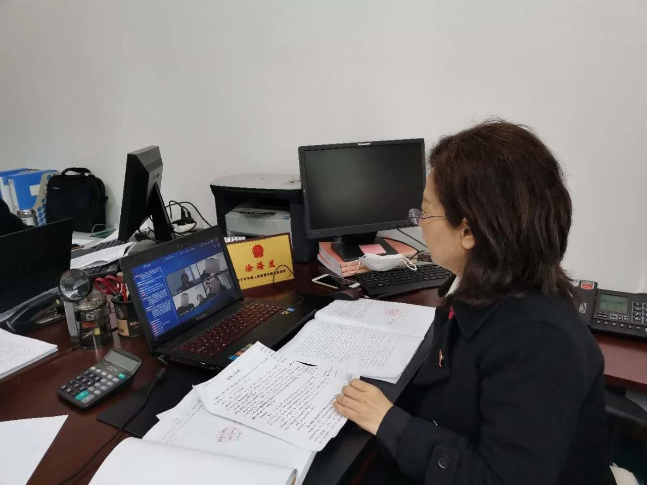 图为咸宁中院法官在线审理减刑假释案件
