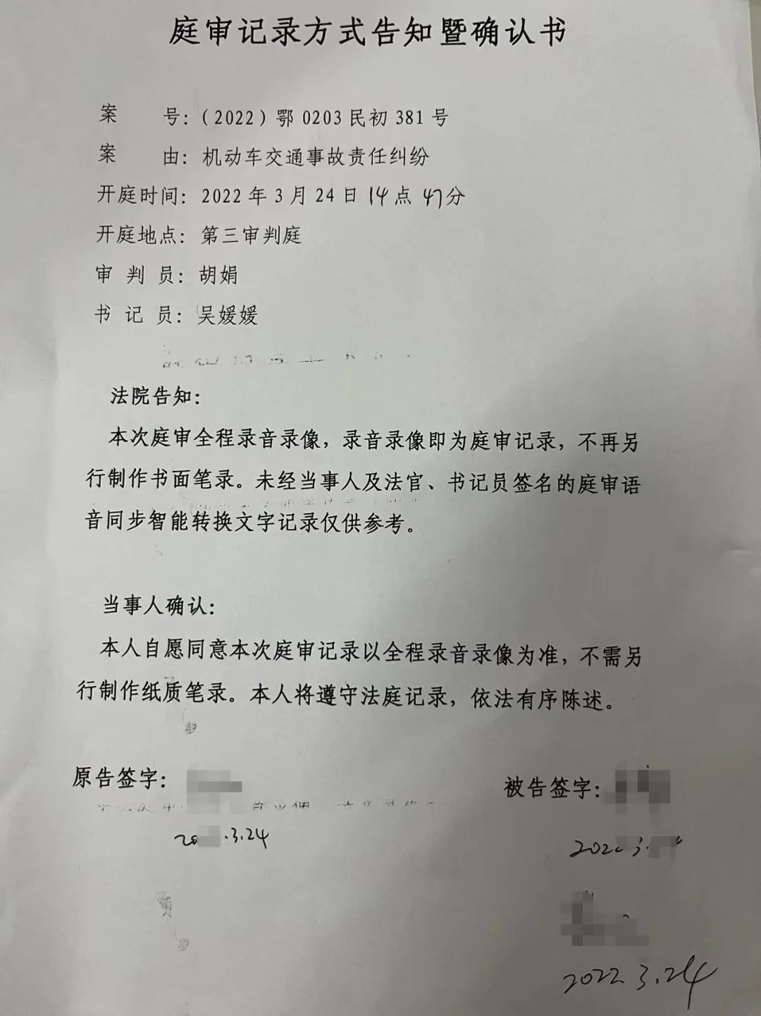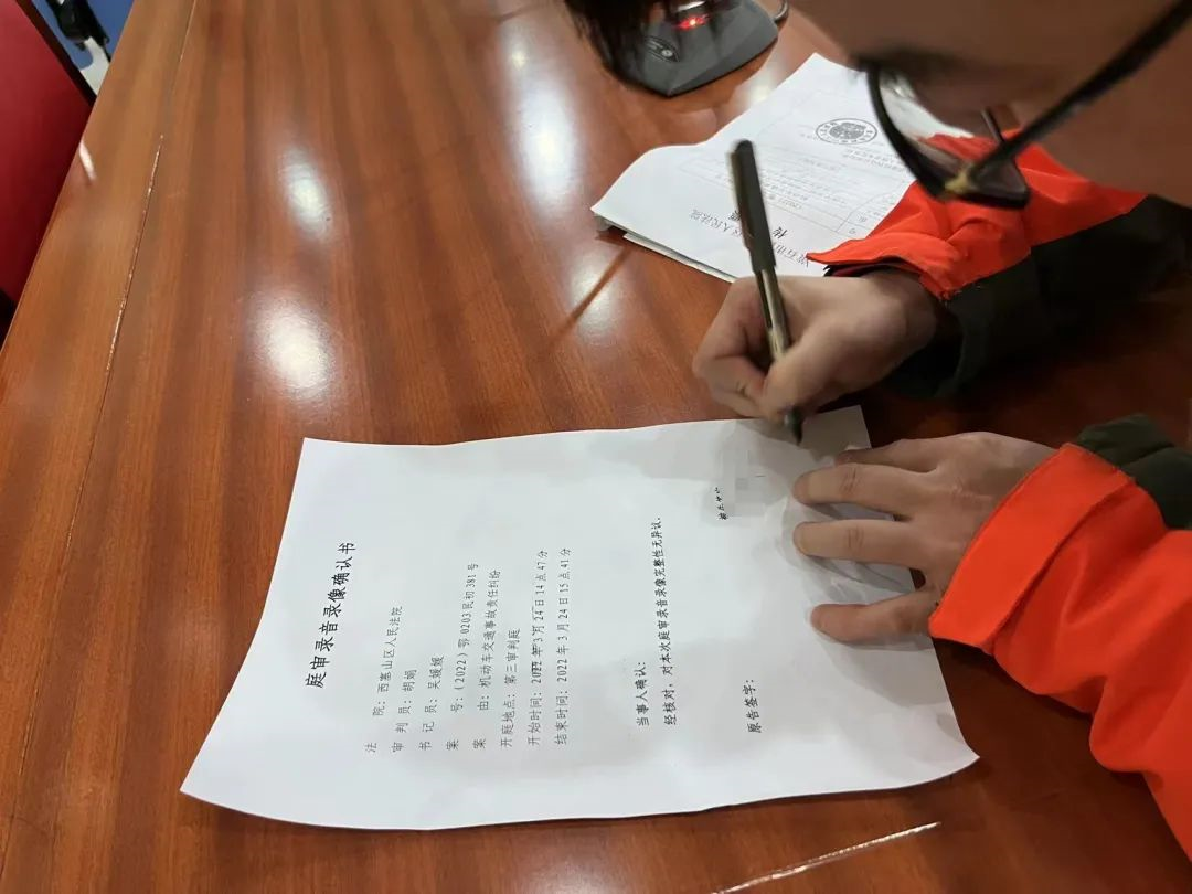 “本次庭审将实行同步录音录像替代书记员法庭记录,录音录像即为庭审记录,录音录像与纸质笔录具有同等效力。”审判员在庭前释明“无书记员”模式,征得原、被告双方同意后,庭审正式开始。