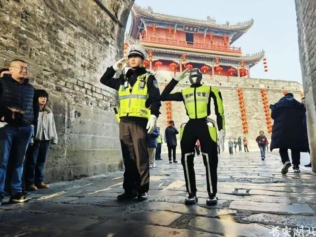 尤为引人注目的是,在具有深厚历史底蕴的荆州古城寅宾门,荆州交警设立了机器人交警宣传打卡点,循环播放安全出行提示、普及交通安全知识。民警与机器人协同向群众发放安全宣传册、引导合影,为古老的城门增添了现代科技的生动注脚。